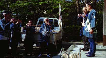 初日の早朝に安全と成功を祈願してい乾杯します。組長と自治会長です。