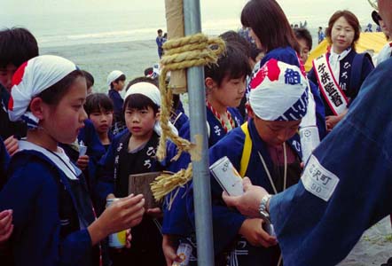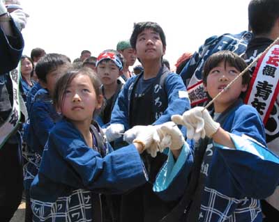 5日の「子供凧上げ」子供も糸先を持ちます。
