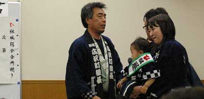 会所開きです。初子さんが紹介されて、栗沢組長からたすきが掛けられます。