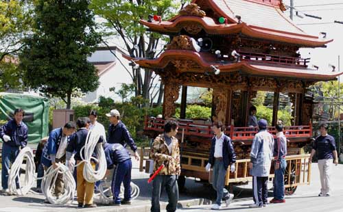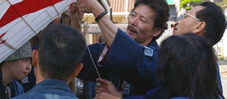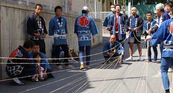 糸目付けです。ご家族が3本の親糸を凧に取りつけます。結び方はとても複雑です。