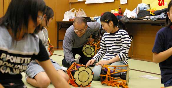 お囃子の練習です。佐藤さんに代わり水口先生にご指導いただいています。