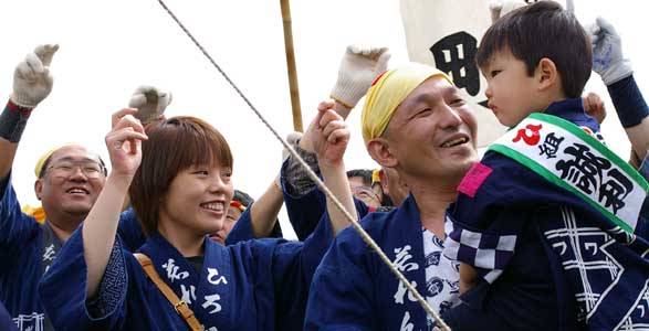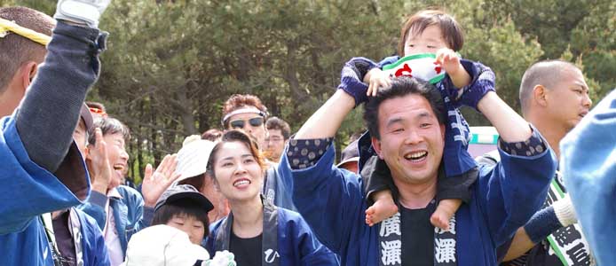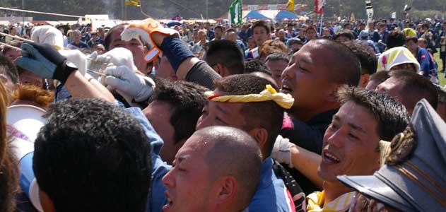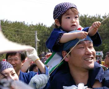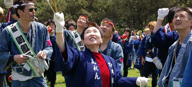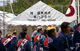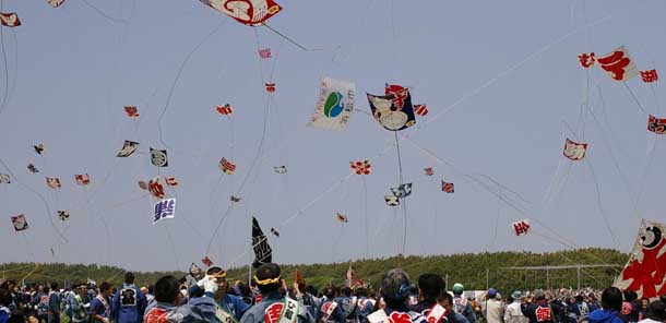開会式で各町が一斉に凧を揚げます。中央に新しい市のマークの凧が見えます。