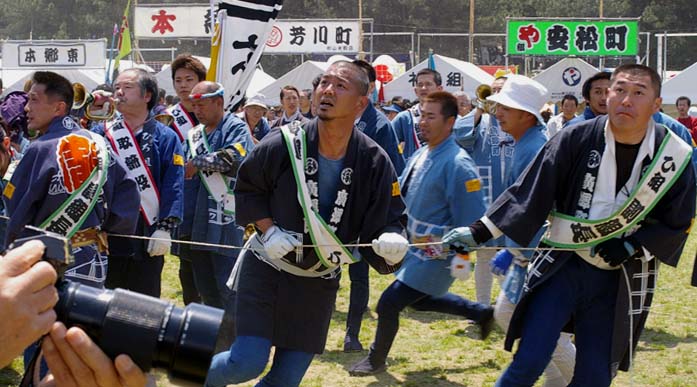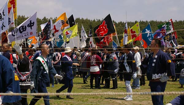 開会式の様子です。各町が一斉に凧を揚げるので糸が沢山見えます。