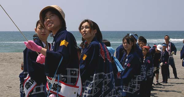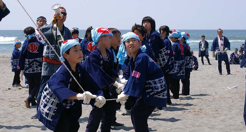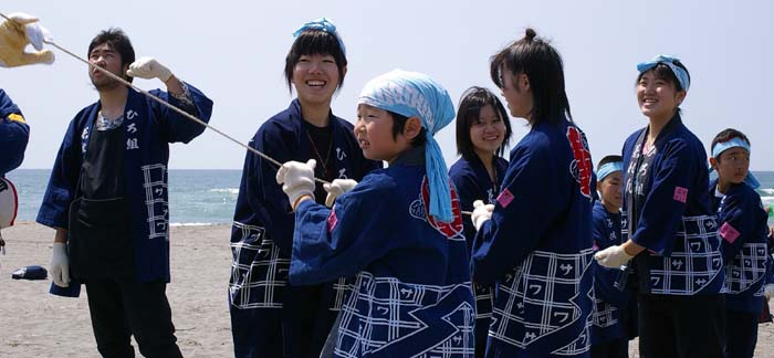 子供たちは砂浜で凧を揚げます。この日は5帖を揚げましが、風があり良くあがりました。