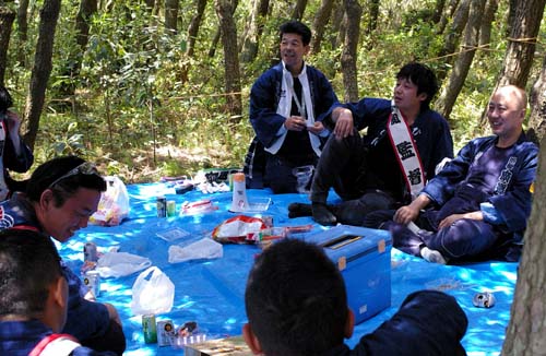 昼食を終え、子供たちが遊びに出かけると、お父さんたちは松林の中の涼しい所でつろぎます。