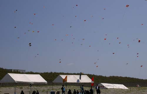 子供用の「陣屋」とその向こうに見える大人の会場で上げている凧です
