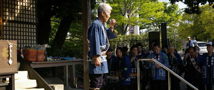 | 初日朝の出陣式です。山田組長が代表して参拝の後、ひ組凧上げ会会長の 杉浦さんの音頭で成功を祈念して乾杯します。 |