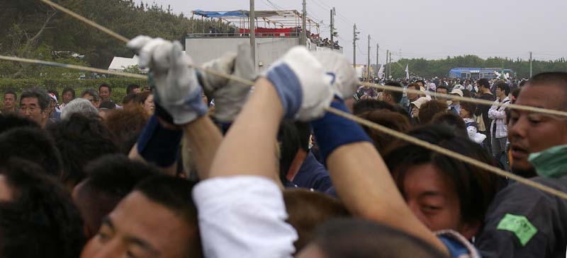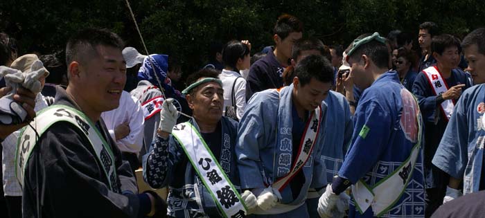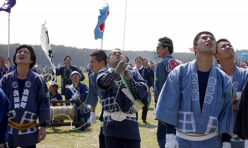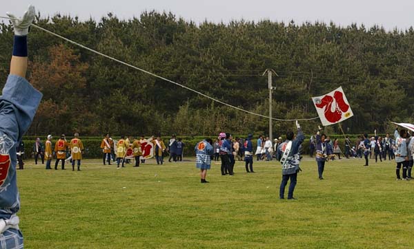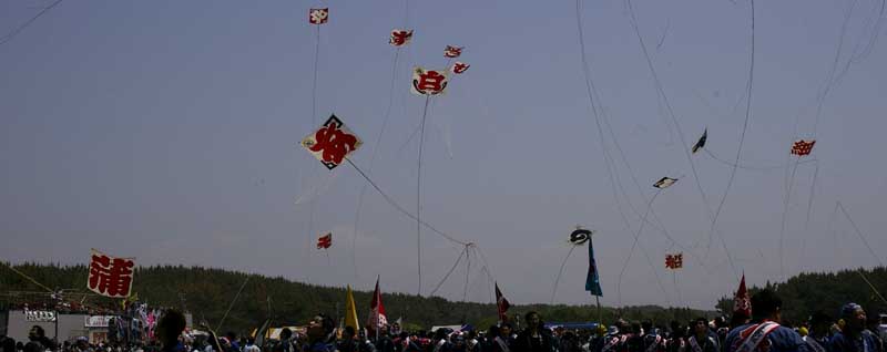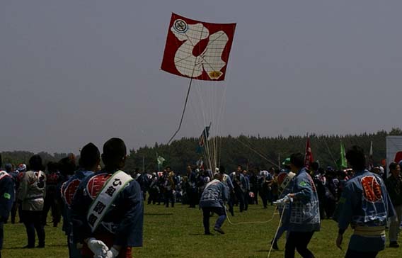 | 一度全ての凧をおろして、11時の花火を合図に全町が一斉に凧を上げる のが開会式ですが、今年は足並みがそろわなかったように見えました。 |