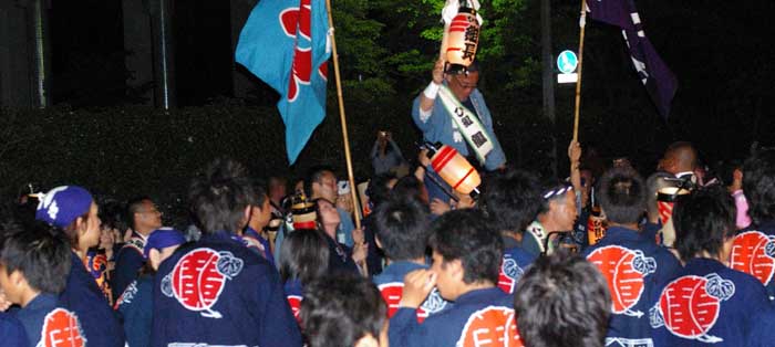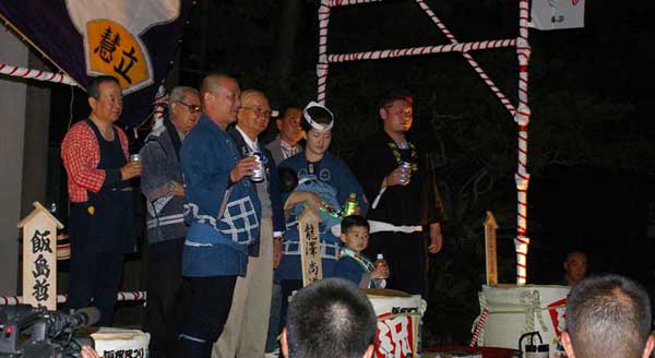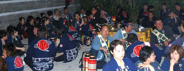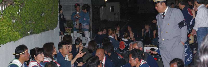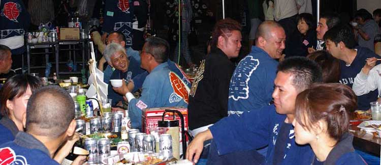 路地を塞いでの宴会です。地元から出ている祭本部役員の方もお祝いに来ています