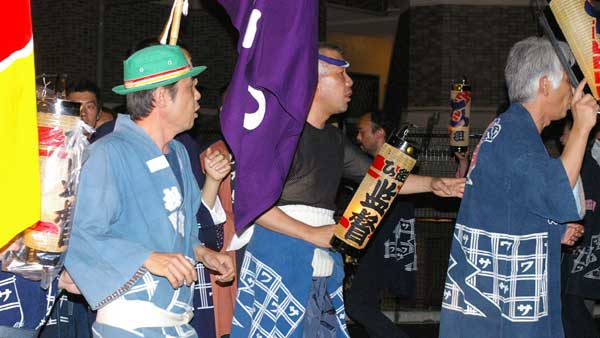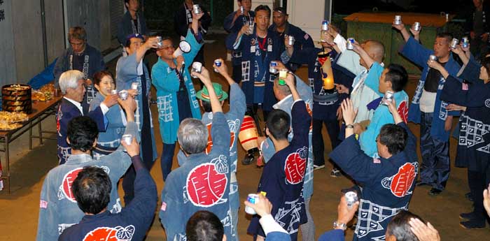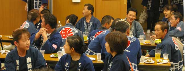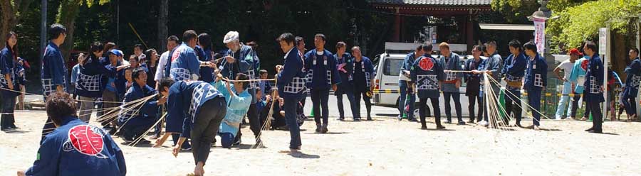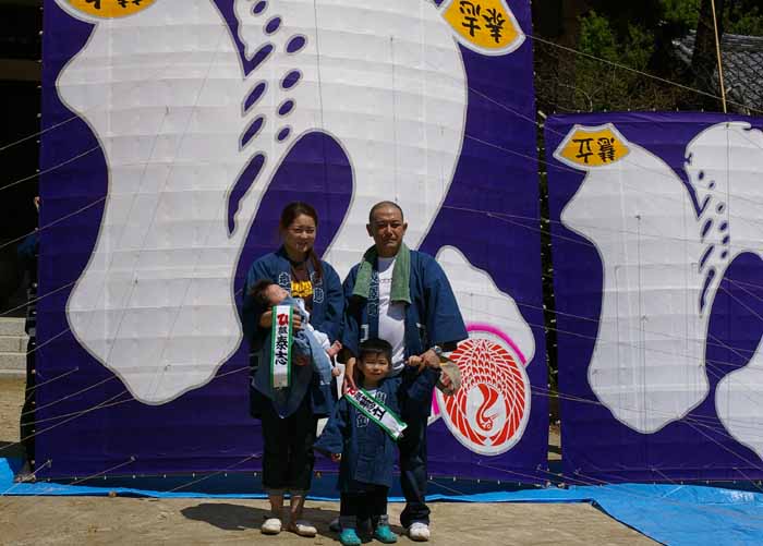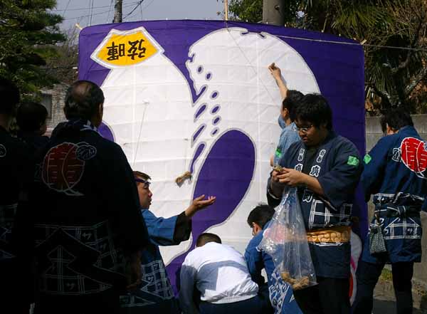 | 初子さんのお宅まで凧を運び、ご家族に親糸を付けてもらいます。子糸は町内の若い衆が 付けます。その後に宴会が始まることもあります。 |