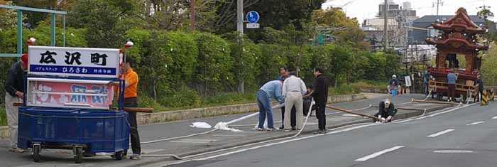 | 屋台の掃除をして、曳き綱を取り付けます。電気系のチェックもします。 |