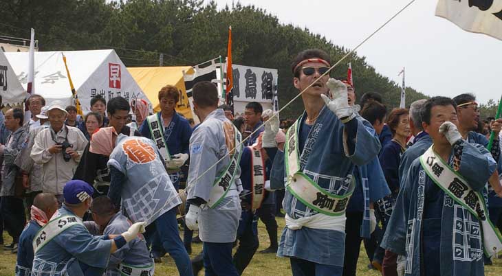 笛の合図で糸を出したり引いたりします